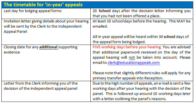 If you have not been offered a place following an in year application, the law entitles you to appeal to an Independent Appeal Panel. This panel is completely independent of the school and the Local Authority. Appeals for In year admissions are held online.